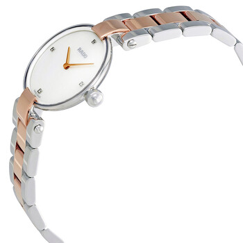 Stainless steel case with a two-tone (silver and rose gold-tone) stainless steel bracelet. Fixed stainless steel bezel. Mother of pearl dial with rose gold-tone hands. Diamonds mark the 3, 6, 9 and 12 o'clock positions. Dial Type: Analog. Quartz movement. Scratch resistant sapphire crystal. Pull / push crown. Solid case back. Case size: 27 mm. Case thickness: 8 mm. Round case shape. Band width: 13 mm. Deployment clasp. Water resistant at 50 meters / 165 feet. Functions: hour, minute. Dress watch style. Watch label: Swiss Made. Rado Coupolse Mother of Pearl Diamond Dial Ladies Watch R22854913.