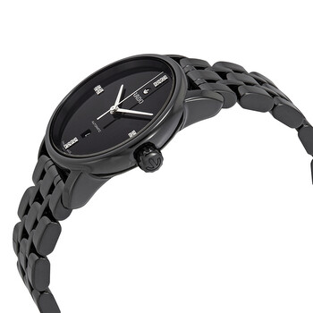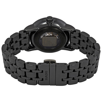 Black (high-tech) ceramic case and bracelet. Fixed black (high-tech) ceramic bezel. Black dial with silver-tone hands. Diamond-set index markers at the 3, 6, 9 and 12 o'clock position. Dial Type: Analog. Date display above the 6 o'clock position. Rado calibre 580 (ETA 2681) automatic movement, based upon ETA 2681, containing 25 Jewels, bitting at 28800 vph, and has a power reserve of approximately 38 hours. Scratch resistant sapphire crystal. Pull / push crown. Transparent case back. Round case shape. Case size: 33 mm. Case thickness: 10 mm. Band width: 17 mm. Band length: 6.5 inches. Titanium fold over clasp with a safety release. Water resistant at 50 meters / 165 feet. Functions: date, hour, minute, second. Additional Info: 8 white diamond hour markers on dial. Dress watch style. Watch label: Swiss Made. Rado DiaMaster Automatic Diamond Black Dial Ladies Watch R14043717.