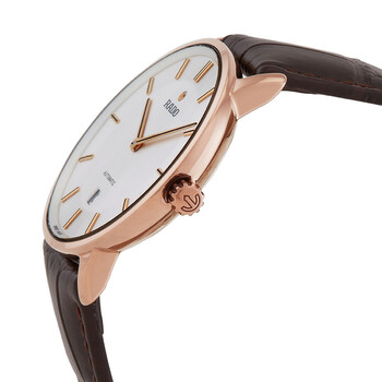 Rose gold-tone ceramos™ case with a brown leather strap. Fixed rose gold-tone bezel. Silver dial with rose gold-tone hands and index hour markers. Dial Type: Analog. Date display at the 6 o'clock position. Rado Calibre R766 automatic movement with a 72-hour power reserve. Scratch resistant sapphire crystal. Transparent see through case back. Round case shape, case size: 40.3 mm, case thickness: 8.30 mm. Folding clasp. Water resistant at 50 meters / 165 feet. Functions: date, hour, minute, second. Diamaster Series. Sport watch style. Watch label: Swiss Made. Item Variations: 01.766.6068.3.403. Rado DiaMaster Automatic Silver Dial Men's Watch R14068036.