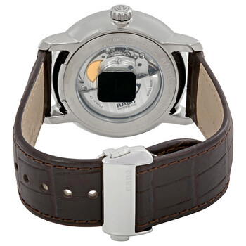 Plasma high-tech ceramic case with a brown leather strap. Fixed plasma high-tech ceramic bezel. Silver dial with rose gold-tone hands and Roman numeral hour markers. Minute markers around the outer rim. Dial Type: Analog. Date display at the 6 o'clock position. Rado calibre 763 (ETA C07.611) automatic movement with an 80-hour power reserve. Scratch resistant sapphire crystal. Transparent case back. Round case shape. Case size: 41 mm. Case thickness: 10.2 mm. Deployment clasp. Water resistant at 50 meters / 165 feet. Functions: date, hour, minute, second. Dress watch style. Watch label: Swiss Made. Rado DiaMaster Automatic Silver Dial Men's Watch R14806106.