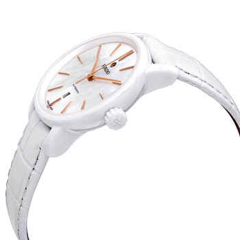 White ceramic and stainless steel case with a white leather strap. Fixed white ceramic and stainless steel bezel. White mother of pearl dial with rose gold-tone hands and index hour markers. Dial Type: Analog. Date display at the 6 o'clock position. Rado Calibre 580 (ETA 2681) automatic movement with a 38-hour power reserve. Scratch resistant sapphire crystal. Pull / push crown. Transparent case back. Round case shape, case size: 33 mm, case thickness: 10 mm. Band width: 16 mm, band length: 6.5 inches. Fold over clasp. Water resistant at 50 meters / 165 feet. Functions: date, hour, minute, second. Casual watch style. Watch label: Swiss Made. Rado DiaMaster Automatic White Mother of Pearl Dial Ladies Watch R14044925.