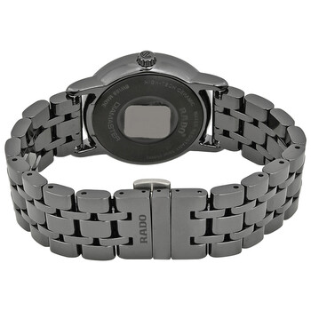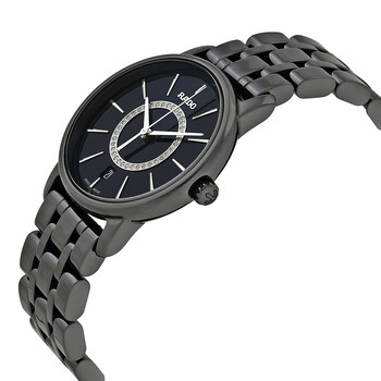 Black (high-tech) ceramic case and bracelet. Fixed black (high-tech) ceramic bezel. Black (diamond set) dial with silver-tone hands and index hour markers. Dial Type: Analog. Date display at the 6 o'clock position. ETA caliber E63.111 quartz movement. Scratch resistant sapphire crystal. Pull / push crown. Solid case back. Round case shape. Case size: 33 mm. Case thickness: 8 mm. Band width: 17 mm. Fold over clasp with a push button release. Water resistant at 50 meters / 165 feet. Functions: date, hour, minute, second. Diamaster Series. Dress watch style. Watch label: Swiss Made. Rado DiaMaster Black Diamond Dial Black Ceramic Ladies Watch R14063737.