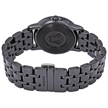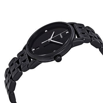 Black (high tech) ceramic case and bracelet. Fixed black (high tech) ceramic bezel. Black dial with silver-tone hands. Diamonds appear at the 3, 6, 9 and 12 o'clock positions. Dial Type: Analog. Date display at the 6 o'clock position. Rado calibre 218 quartz movement. Scratch resistant sapphire crystal. Pull / push crown. Transparent case back. Round case shape. Case size: 33 mm. Case thickness: 8 mm. Band width: 20 mm. Deployment clasp with a push button release. Water resistant at 50 meters / 165 feet. Functions: date, hour, minute, second. Diamaster Series. Dress watch style. Watch label: Swiss Made. Rado DiaMaster Diamond Black Dial Ladies Watch R14063717.