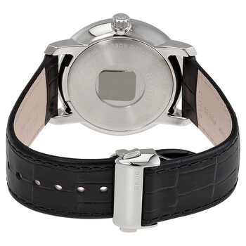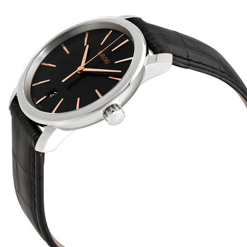 Stainless steel case with a black leather strap. Fixed stainless steel bezel. Black dial with gold-tone hands and index hour markers. Dial Type: Analog. Date display at the 6 o'clock position. Quartz movement. Scratch resistant sapphire crystal. Screw down crown. Solid case back. Round case shape. Case size: 40 mm. Case thickness: 9 mm. Band width: 21 mm. Band length: 8 inches. Deployment clasp. Water resistant at 100 meters / 330 feet. Functions: date, hour, minute, second. Dress watch style. Watch label: Swiss Made. Rado DiaMaster Quartz Black Dial Men's Watch R14078165.