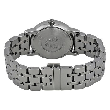 Plasma (high tech) ceramic case with a plasma (high tech) ceramic bracelet. Fixed plasma (high tech) ceramic bezel. Silver dial with rose gold-tone hands and index hour markers. Dial Type: Analog. Date display at the 6 o'clock position. Quartz movement. Scratch resistant sapphire crystal. Pull / push crown. Solid case back. Round case shape. Case size: 33 mm. Case thickness: 8 mm. Band width: 17 mm. Fold over clasp with a push button release. Water resistant at 100 meters / 330 feet. Functions: date, hour, minute, second. Diamaster Series. Dress watch style. Watch label: Swiss Made. Rado DiaMaster Silver Dial Ladies Ceramic Watch R14064107.