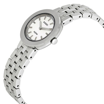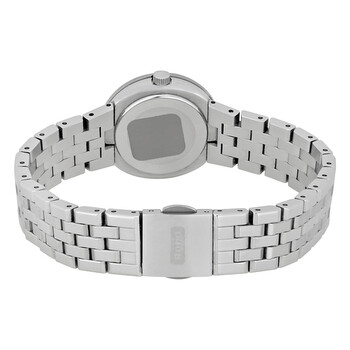 Silver-tone hardmetal case with a silver-tone hardmetal bracelet. Fixed bezel. White dial with silver-tone hands and index hour markers. Dial Type: Analog. Quartz movement. Scratch resistant sapphire crystal. Solid case back. Round case shape. Case size: 26 mm. Deployment clasp. Water resistant at 30 meters / 100 feet. Functions: hour, minute. Dress watch style. Watch label: Swiss Made. Rado Diamaster White Dial Ladies Watch R14342013.