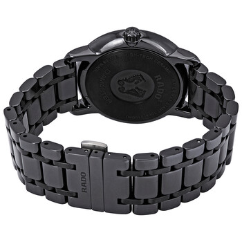 Black ceramic case with a black ceramic bracelet. Fixed black ceramic bezel. Black dial with rose gold-tone hands and index hour markers. Minute markers around the outer rim. Dial Type: Analog. Date display above the 6 o'clock position. Quartz movement. Scratch resistant sapphire crystal. Pull / push crown. Solid case back. Round case shape. Case size: 41 mm. Case thickness: 9 mm. Band width: 20 mm. Band length: 7.5 inches. Fold over with push button release clasp. Water resistant at 50 meters / 165 feet. Functions: date, hour, minute, second. Casual watch style. Watch label: Swiss Made. Rado Diamaster XL Black Dial Black Ceramic Men's Watch R14066152.