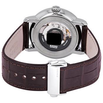 Plasma high-tech ceramic case with a brown leather strap. Silver dial with rose gold-tone hands and index hour markers. Dial Type: Analog. Date display at the 6 o'clock position. Automatic movement. Scratch resistant sapphire crystal. Transparent case back. Case size: 41 mm. Case thickness: 9.9 mm. Round case shape. Water resistant at 100 meters / 330 feet. Functions: date, hour, minute, second. Dress watch style. Watch label: Swiss Made. Rado DiaMaster XL Silver Dial Automatic Men's Leather Watch R14074086.