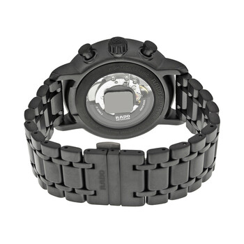 Black ceramic case with a black ceramic bracelet. Fixed black ceramic bezel. Black dial with grey hands and index hour markers. Minute markers around the outer rim. Dial Type: Analog. Date display between 4 and 5 o'clock positions. Chronograph - three sub-dials displaying: 60 second, 30 minute and 12 hour. Automatic movement. Scratch resistant sapphire crystal. Screw down crown. Transparent case back. Case diameter: 45 mm. Round case shape. Hidden double folding deployment clasp. Water resistant at 100 meters / 330 feet. Functions: chronograph, date, hour, minute, second. Dress watch style. Rado DiaMaster XXL Automatic Chronograph Black Dial Black Ceramic Men's Watch R14090192.