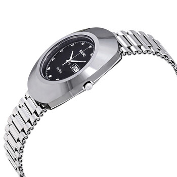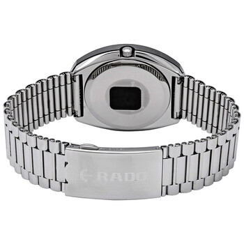 Stainless steel case with a stainless steel bracelet. Fixed stainless steel bezel. Black dial with luminous silver-tone hands and diamond hour markers. Minute markers around the outer rim. Dial Type: Analog. Day of the week and date display at the 3 o'clock position. Quartz movement. Scratch resistant sapphire crystal. Screw down crown. Solid case back. Case dimensions: 43 mm x 35 mm. Oval case shape. Band width: 22 mm. Deployment clasp. Water resistant at 30 meters / 100 feet. Functions: date, day, hour, minute, second. Casual watch style. Watch label: Swiss Made. Rado Diastar Black Dial Stainless Steel Men's Watch R12391153.