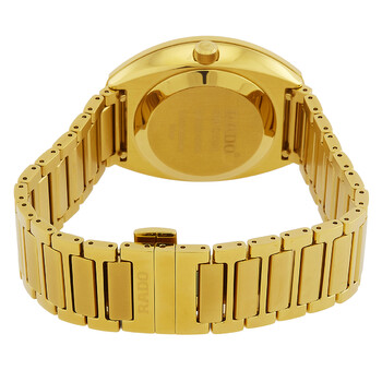 Gold-tone stainless steel case and bracelet. Fixed gold-tone stainless steel bezel. Gold dial with gold-tone hands and diamond hour markers. Dial Type: Analog. Day of the week and date display at the 6 o'clock position. Rado Calibre 764 automatic movement with an 80-hour power reserve. Scratch resistant sapphire crystal. Pull / push crown. Solid case back. Oval case shape, case size: 38 mm, case thickness: 12.1 mm. Deployment with push button release clasp. Water resistant at 100 meters / 330 feet. Functions: date, day, hour, minute, second. Diastar Original Series. Dress watch style. Watch label: Swiss Made. Rado Diastar Original Automatic Diamond Gold Dial Unisex Watch R12161733.