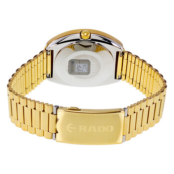 Gold PVD stainless steel case and bracelet. Fixed gold PVD bezel. Gold dial with luminous gold-tone hands and diamond hour markers. Minute markers around the outer rim. Dial Type: Analog. Luminescent hands. Day of the week and date display at the 6 o'clock position. Rado calibre 648 (ETA 2836-2) automatic movement, based upon ETA 2836-2, containing 25 Jewels, bitting at 28800 vph, and has a power reserve of approximately 40 hours. Scratch resistant sapphire crystal. Screw down crown. Solid case back. Round case shape. Case dimensions: 43 mm x 35 mm. Case thickness: 12 mm. Band width: 20 mm. Deployment clasp. Water resistant at 30 meters / 100 feet. Functions: date, day, hour, minute, second. Additional Info: withstands rain and splashes of water, but not showering or submersion. Original Series. Dress watch style. Watch label: Swiss Made. Item Variations: 648.0413.3.049. Rado Original Jubile Gold Automatic Gold Dial Gold PVD Men's Watch R12413493.