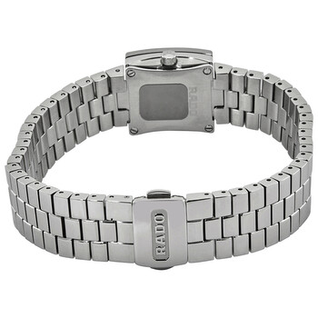 Silver-tone stainless steel case with a stainless steel bracelet. Fixed bezel. Black dial with silver-tone hands and index hour markers. Dial Type: Analog. Quartz movement. Scratch resistant sapphire crystal. Pull / push crown. Solid case back. Square case shape. Case size: 20 mm. Folding clasp. Water resistant at 30 meters / 100 feet. Functions: hour, minute. Dress watch style. Watch label: Swiss Made. Rado Diastar Quartz Black Dial Ladies Watch R18682183.