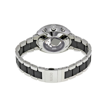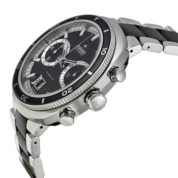 Stainless steel case with a stainless steel bracelet with black ceramic center links. Fixed stainless steel bezel with black ceramic top ring. Black dial with luminous silver-tone hands and index hour markers. Minute markers around the outer rim. Dial Type: Analog. Luminescent hands and markers. Date display at the 6 o'clock position. Chronograph - two sub-dials displaying: 60 second and 30 minute. Automatic movement. Scratch resistant sapphire crystal. Skeleton case back. Case diameter: 44 mm. Case thickness: 16 mm. Round case shape. Band width: 20 mm. Band length: 7.5 inches. Deployment clasp with push button release. Water resistant at 200 meters / 660 feet. Functions: date, hour, minute, second. Sport watch style. Watch label: Swiss Made. Rado D-Star Automatic Chronograph Black Dial Stainless Steel with Black Ceramic Men's Watch R15965152.