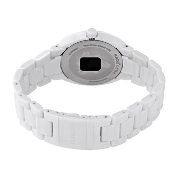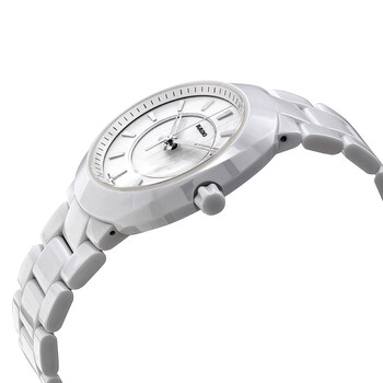 White ceramic case with a white ceramic bracelet. Fixed white ceramic bezel. White dial with luminous silver-tone hands and index hour markers. Minute markers around the outer rim. Dial Type: Analog. Luminescent hands. Date display at the 3 o'clock position. Quartz movement. Scratch resistant sapphire crystal. Pull / push crown. Solid case back. Oval case shape. Case size: 38 mm. Case thickness: 9 mm. Band width: 22 mm. Band length: 7.5 inches. Titanium double fold over clasp. Water resistant at 100 meters / 330 feet. Functions: date, hour, minute, second. Luxury watch style. Watch label: Swiss Made. Rado D-Star Quartz White Dial Ladies Watch R15519102.