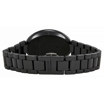 Black (high-tech) ceramic case and bracelet. Fixed black (high-tech) ceramic bezel. Black dial with steel hands. Diamonds appear at the 3, 6, 9 and 12 o'clock positions. Dial Type: Analog. ETA caliber F10.001 quartz movement. Scratch resistant sapphire crystal. Solid case back. Oval case shape. Case dimensions: 42 mm x 33 mm. Case thickness: 8.3 mm. Band width: 15 mm. Fold over clasp with a push button release. Water resistant at 30 meters / 100 feet. Functions: hour, minute. Esenza Series. Casual watch style. Watch label: Swiss Made. Rado Esenza Touch Jubile Black Dial Ladies Watch R53093712.