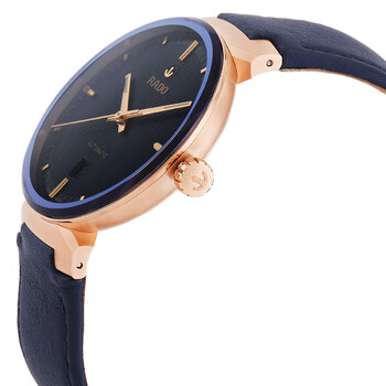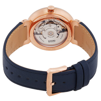 Rose gold-tone stainless steel case with a blue leather strap. Fixed blue stainless steel bezel. Blue dial with rose gold-tone hands and index hour markers. Minute markers around the outer rim. Dial Type: Analog. Date display at the 6 o'clock position. Rado Calibre 763 (ETA C07.611) Automatic movement, based upon ETA C07.611, containing 25 Jewels, bitting at 21600 vph, and has a power reserve of approximately 80 hours. Scratch resistant sapphire crystal. Pull / push crown. Transparent case back. Round case shape, case size: 39 mm, case thickness: 11 mm. Buckle clasp. Water resistant at 50 meters / 165 feet. Functions: date, hour, minute, second. Florence Series. Casual watch style. Watch label: Swiss Made. Rado Florence Automatic Blue Dial Unisex Watch R48905205.
