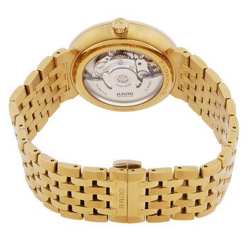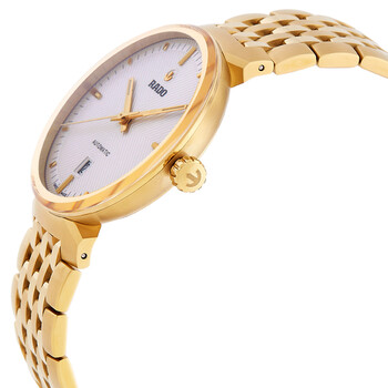 Yellow gold-tone stainless steel case and bracelet. Fixed yellow gold-tone stainless steel bezel. Silver white dial with yellow gold-tone hands and index hour markers. Minute markers around the outer rim. Dial Type: Analog. Date display at the 6 o'clock position. Rado Calibre 763 (ETA C07.611) Automatic movement, based upon ETA C07.611, containing 25 Jewels, bitting at 21600 vph, and has a power reserve of approximately 80 hours. Scratch resistant sapphire crystal. Pull / push crown. Transparent case back. Round case shape, case size: 39 mm, case thickness: 11 mm. Deployment with push button release clasp. Water resistant at 50 meters / 165 feet. Functions: date, hour, minute, second. Florence Series. Casual watch style. Watch label: Swiss Made. Rado Florence Automatic Silver White Dial Unisex Watch R48904013.