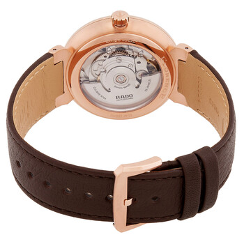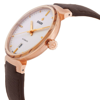 Rose gold PVD stainless steel case with a brown leather strap. Fixed rose gold PVD stainless steel bezel. Silver white dial with rose gold-tone hands and index hour markers. Minute markers around the outer rim. Dial Type: Analog. Date display at the 6 o'clock position. Rado Calibre 763 (ETA C07.611) Automatic movement, based upon ETA C07.611, containing 25 Jewels, bitting at 21600 vph, and has a power reserve of approximately 80 hours. Scratch resistant sapphire crystal. Pull / push crown. Transparent case back. Round case shape, case size: 39 mm, case thickness: 11 mm. Buckle clasp. Water resistant at 50 meters / 165 feet. Functions: date, hour, minute, second. Florence Series. Casual watch style. Watch label: Swiss Made. Rado Florence Automatic Silver White Dial Unisex Watch R48905015.
