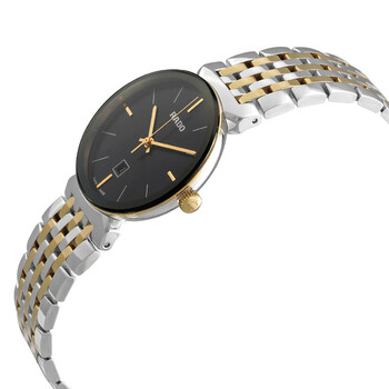 Silver-tone stainless steel case with a two-tone (silver-tone and yellow gold-tone) stainless steel bracelet. Fixed black bezel. Black dial with yellow gold-tone hands and index hour markers. Dial Type: Analog. Date display at the 6 o'clock position. Quartz movement. Scratch resistant sapphire crystal. Solid case back. Round case shape, case size: 30 mm. Fold over clasp with a safety release. Water resistant at 50 meters / 165 feet. Functions: date, hour, minute, second. Additional Info: original box, international warranty card, manual (complete accessories). Florence Series. Luxury watch style. Watch label: Swiss Made. Rado Florence Quartz Black Dial Ladies Watch R48913153.