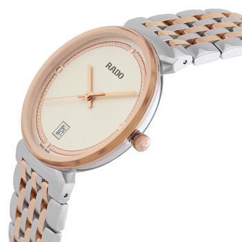 Silver-tone stainless steel case with a two-tone (silver-tone and rose gold PVD) stainless steel bracelet. Fixed rose gold pv stainless steel bezel. Champagne dial with rose gold-tone hands. Dial Type: Analog. Date display at the 6 o'clock position. Rado Calibre R073 quartz movement. Scratch resistant sapphire crystal. Pull / push crown. Solid case back. Round case shape, case size: 38 mm, case thickness: 8.7 mm. Fold over clasp with a safety release. Water resistant at 50 meters / 165 feet. Functions: date, hour, minute, second. Florence Series. Luxury watch style. Watch label: Swiss Made. Rado Florence Quartz Champagne Dial Unisex Watch R48912403.