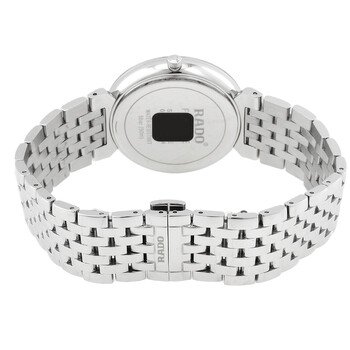 Silver-tone stainless steel case and bracelet. Fixed black stainless steel bezel. Black dial with silver-tone hands and diamond hour markers. Dial Type: Analog. Date display at the 6 o'clock position. Quartz movement. Scratch resistant sapphire crystal. Solid case back. Round case shape, case size: 38 mm. Fold over clasp. Water resistant at 50 meters / 165 feet. Functions: date, hour, minute, second. Additional Info: original box, international warranty card, manual (complete accessories). Florence Series. Luxury watch style. Watch label: Swiss Made. Rado Florence Quartz Diamond Black Dial Ladies Watch R48912713.