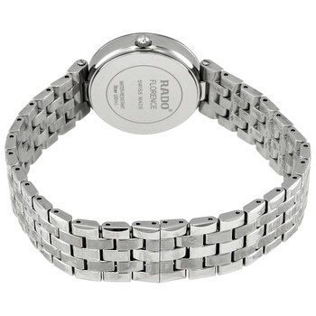 Silver-tone stainless steel case with a silver-tone stainless steel bracelet. Fixed bezel. Silver-tone hands. Dial Type: Analog. Date display at the 6 o'clock position. Quartz movement. Scratch resistant sapphire crystal. Pull / push crown. Round case shape, case size: 28 mm, case thickness: 6.3 mm. Water resistant at 30 meters / 100 feet. Functions: date, hour, minute, second. Dress watch style. Watch label: Swiss Made. Rado Florence Quartz Ladies Watch R48874023.