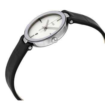 Silver-tone stainless steel case with a black leather strap. Fixed bezel. White dial with silver-tone hands and index hour markers. Dial Type: Analog. Date display at the 3 o'clock position. Quartz movement. Scratch resistant sapphire crystal. Pull / push crown. Round case shape, case size: 28 mm, case thickness: 6.3 mm. Water resistant at 30 meters / 100 feet. Functions: date, hour, minute, second. Dress watch style. Watch label: Swiss Made. Rado Florence Quartz White Dial Ladies Watch R48874015.