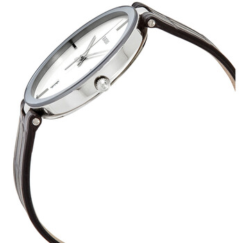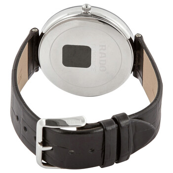 Silver-tone stainless steel case with a black leather strap. Fixed silver-tone stainless steel bezel. White dial with silver-tone hands and index hour markers. Dial Type: Analog. Date display at the 6 o'clock position. Quartz movement. Scratch resistant sapphire crystal. Pull / push crown. Solid case back. Round case shape, case size: 38 mm, case thickness: 6.6 mm. Buckle clasp. Water resistant at 30 meters / 100 feet. Functions: date, hour, minute, second. Casual watch style. Watch label: Swiss Made. Rado Florence Quartz White Dial Men's Watch R48870015.
