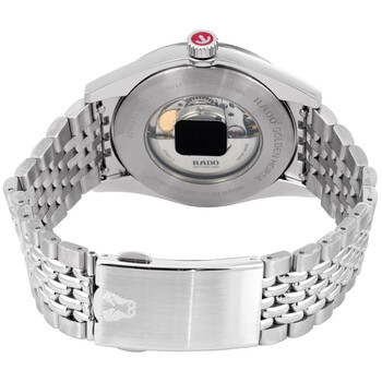 Stainless steel case with a stainless steel bracelet. Fixed stainless steel bezel with plasma (high-tech) ceramic ring. Blue dial with silver-tone hands and index hour markers. Minute markers around the outer rim. Dial Type: Analog. Date display at the 3 o'clock position. Automatic movement with an 80-hour power reserve. Scratch resistant sapphire crystal. Pull / push crown. Transparent case back. Round case shape. Case size: 41.8 mm. Case thickness: 10.4 mm. Band width: 22 mm. Fold over clasp. Water resistant at 50 meters / 165 feet. Functions: date, hour, minute, second. Casual watch style. Watch label: Swiss Made. Rado Golden Horse Automatic Blue Dial Men's Watch R33101203.