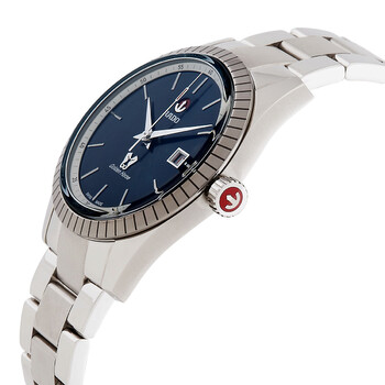 Silver-tone stainless steel and high-tech ceramic case with a silver-tone stainless steel bracelet. Fixed silver-tone stainless steel bezel. Blue dial with silver-tone hands and index hour markers. Minute markers around the outer rim. Dial Type: Analog. Date display at the 3 o'clock position. Automatic movement. Scratch resistant sapphire crystal. Pull / push crown. Transparent case back. Round case shape, case size: 41.8 mm, case thickness: 10.4 mm. Band width: 22 mm. Fold over clasp with a safety release. Water resistant at 50 meters / 165 feet. Functions: date, hour, minute, second. Golden Horse Hyperchrome Classic Series. Casual watch style. Watch label: Swiss Made. Item Variations: 01.763.6101.3.020. Rado Golden Horse HyperChrome Classic Automatic Blue Dial Men's Watch R33101204.