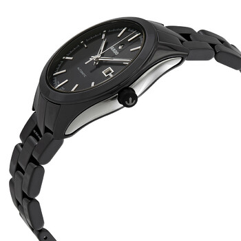 Black ceramic case with a black ceramic bracelet. Fixed black ceramic bezel. Black dial with luminous silver-tone hands and index hour markers. Minute markers around the outer rim. Dial Type: Analog. Luminescent hands and markers. Date display at the 3 o'clock position. ETA caliber 2681 automatic movement, containing 25 Jewels, bitting at 28800 vph, and has a power reserve of approximately 38 hours. Scratch resistant sapphire crystal. Pull / push crown. Solid case back. Round case shape. Case size: 36 mm. Case thickness: 10 mm. Band width: 18 mm. Band length: 7 inches. Fold over clasp with a push button release. Water resistant at 50 meters / 165 feet. Functions: date, hour, minute, second. Hyperchrome Series. Dress watch style. Watch label: Swiss Made. Item Variations: 580.0260.3.015. Rado Hyperchrome Automatic Black Ceramic Ladies Watch R32260152.