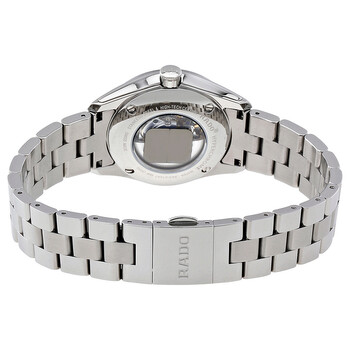 Stainless steel case with a stainless steel bracelet. Fixed stainless steel bezel. Black dial with silver-tone hands and index hour markers. Dial Type: Analog. Date display at the 3 o'clock position. ETA caliber 2681 automatic movement, containing 25 Jewels, bitting at 28800 vph, and has a power reserve of approximately 38 hours. Scratch resistant sapphire crystal. Pull / push crown. Transparent case back. Round case shape. Case size: 30.6 mm. Case thickness: 10 mm. Band width: 17.8 mm. Fold over clasp. Water resistant at 50 meters / 165 feet. Functions: date, hour, minute, second. Dress watch style. Watch label: Swiss Made. Rado Hyperchrome Automatic Black Dial Ladies Watch R32091163.