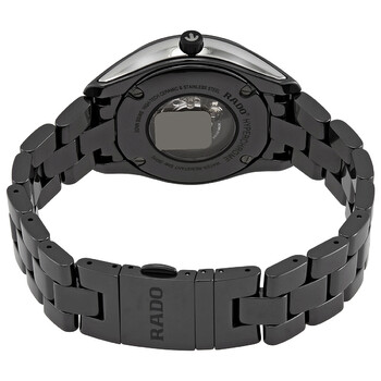 Black (high tech) ceramic case and bracelet. Fixed black (high tech) ceramic bezel. Black dial with silver-tone hands. Diamonds mark the 3, 6, 9 and 12 o'clock positions. Dial Type: Analog. Luminescent hands. Rado calibre 580 (ETA 2681) automatic movement, based upon ETA 2681, containing 25 Jewels, bitting at 28800 vph, and has a power reserve of approximately 38 hours. Scratch resistant sapphire crystal. Pull / push crown. Transparent case back. Round case shape. Case size: 36 mm. Case thickness: 10 mm. Band width: 16 mm. Fold over clasp with a push button release. Water resistant at 50 meters / 165 feet. Functions: date, hour, minute, second. Additional Info: ref# 580.0260.3.070. Hyperchrome Series. Dress watch style. Watch label: Swiss Made. Rado Hyperchrome Automatic Diamond Black Ceramic Ladies Watch R32260702.