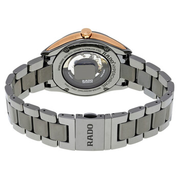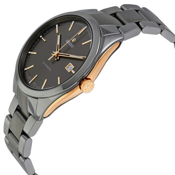Plasma high-tech ceramic case with rose gold PVD accents. A plasma high-tech ceramic bracelet with black titanium links. Fixed plasma high-tech ceramic bezel. Grey dial with luminous rose gold-tone hands and index hour markers. Minute markers around the outer rim. Dial Type: Analog. Luminescent hands and markers. Date display at the 3 o'clock position. Rado calibre 629 (ETA 2892-A2) automatic movement with a 42-hour power reserve. Scratch resistant sapphire crystal. Transparent case back. Round case shape. Case size: 42 mm. Case thicknesss: 10.2 mm. Deployment clasp. Water resistant at 100 meters / 330 feet. Functions: date, hour, minute, second. Dress watch style. Watch label: Swiss Made. Rado Hyperchrome Automatic Grey Dial Men's Watch R32119102