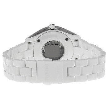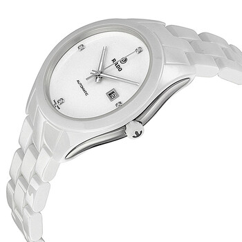 White (high-tech) ceramic case and bracelet. Fixed white (high-tech) ceramic bezel. White dial with silver-tone hands. Diamonds set at the 3, 6, 9 and 12 o'clock positions. Dial Type: Analog. Date display at the 3 o'clock position. Rado calibre 580 (ETA 2681) automatic movement, based upon ETA 2681, containing 25 Jewels, bitting at 28800 vph, and has a power reserve of approximately 38 hours. Scratch resistant sapphire crystal. Pull / push crown. Skeleton case back. Round case shape. Case size: 36 mm. Case thickness: 10.4 mm. Band width: 18 mm. Deployment clasp. Water resistant at 50 meters / 165 feet. Functions: date, hour, minute, second. Additional Info: ref# 580.0258.3.070. Hyperchrome Series. Casual watch style. Watch label: Swiss Made. Rado Hyperchrome Automatic White Dial White Ceramic Diamond Ladies Watch R32258702.