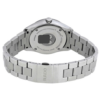 Stainless steel case with a stainless steel bracelet. Fixed silver-tone ceramos bezel. Black dial with luminous silver-tone hands and index hour markers. Dial Type: Analog. Luminescent hands. Date display at the 3 o'clock position. Quartz movement. Scratch resistant sapphire crystal. Pull / push crown. Solid case back. Round case shape. Case dimensions: 39 mm x 47 mm. Case thickness: 10 mm. Band width: 19 mm. Band length: 8 inches. Fold over clasp with a push button release. Water resistant at 50 meters / 165 feet. Functions: date, hour, minute, second. Dress watch style. Watch label: Swiss Made. Rado Hyperchrome Black Dial Men's Watch R32297153.