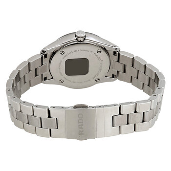 Stainless steel case with a stainless steel bracelet. Fixed silver-tone ceramos bezel. Blue dial with luminous silver-tone hands and index hour markers. Minute markers around the outer rim. Dial Type: Analog. Luminescent hands and markers. Date display at the 3 o'clock position. Quartz movement. Scratch resistant sapphire crystal. Pull / push crown. Solid case back. Round case shape. Case dimensions: 31 mm x 37.5 mm. Case thickness: 9 mm. Band width: 15 mm. Band length: 7 inches. Fold over clasp with a push button release. Water resistant at 50 meters / 165 feet. Functions: date, hour, minute, second. Dress watch style. Watch label: Swiss Made. Rado HyperChrome Blue Dial Ladies Watch R32110203.