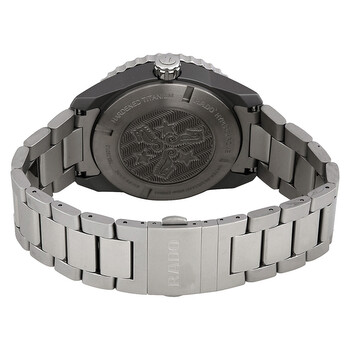 Silver-tone (carbon diffused) steel case with a silver-tone hardened titanium bracelet. Uni-directional rotating coin edge stainless steel bezel with a blue ceramic (count-up elapsed time) top ring. Navy dial with luminous silver-tone arrow-shaped hands and index hour markers. Minute markers around the outer rim. Dial Type: Analog. Luminescent hands and markers. Date display at the 3 o'clock position. Rado calibre 763 (ETA C07.611) automatic movement, based upon ETA C07.611, containing 25 Jewels, bitting at 21600 vph, and has a power reserve of approximately 80 hours. Scratch resistant sapphire crystal. Screw down crown. Solid case back. Round case shape. Case size: 45 mm. Case thickness: 13.8 mm. Hidden deployment clasp. Water resistant at 200 meters / 660 feet. Functions: date, hour, minute, second. Hyperchrome Captain Cook Series. Dress watch style. Watch label: Swiss Made. Rado HyperChrome Captain Cook Automatic Men's Watch R32501203.