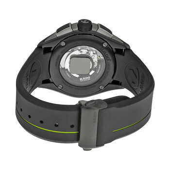 Black (high-tech) ceramic case with a black rubber strap. Fixed black (high-tech) ceramic bezel. Black dial with luminous black hands and index hour markers. Minute markers around the outer rim. Dial Type: Analog. Luminescent hands and markers. Date display between the 4 and 5 o'clock positions. Chronograph - three sub-dials displaying: 60 second, 30 minute and 12 hour. Rado calibre 650 (ETA 2894-2) automatic movement, containing 37 Jewels, bitting at 28800 vph, and has a power reserve of approximately 38 hours. Scratch resistant sapphire crystal. Pull / push crown. Skeleton case back. Round case shape. Case size: 45 mm. Case thickness: 13 nn. Band width: 24 mm. Deployment clasp. Water resistant at 100 meters / 330 feet. Functions: chronograph, date, hour, minute, second. Additional Info: 650.0525.3.117. Hyperchrome Series. Casual watch style. Watch label: Swiss Made. Rado Hyperchrome Chronograph Black Dial Black Rubber Men's Watch R32525179.