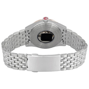 Stainless steel, ceramos™, titanium case with a stainless steel bracelet. Fixed rose gold-tone bezel. Mother of pearl dial with rose gold-tone hands and diamond hour markers. Minute scale around the inner rim. Dial Type: Analog. Date display at the 3 o'clock position. Automatic movement with a 38-hour power reserve. Scratch resistant sapphire crystal. Pull / push crown. Transparent see through case back. Round case shape, case size: 35 mm, case thickness: 10.1 mm. Fold-over clasp. Water resistant at 50 meters / 165 feet. Functions: date, hour, minute, second. Additional Info: 12 diamonds, 0.078 carat. Hyperchrome Classic Series. Dress watch style. Watch label: Swiss Made. Rado HyperChrome Classic Automatic Diamond Ladies Watch R33102903.