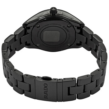 Black ceramic case with a black ceramic bracelet. Fixed black ceramic bezel. Black dial with luminous silver-tone hands and index hour markers. Dial Type: Analog. Luminescent hands and markers. Quartz movement. Scratch resistant sapphire crystal. Pull / push crown. Solid case back. Round case shape. Case size: 36 mm. Case thickness: 10 mm. Band width: 18 mm. Fold over clasp with a push button release. Water resistant at 50 meters / 165 feet. Functions: hour, minute, second. Hyperchrome Series. Casual watch style. Watch label: Swiss Made. Rado HyperChrome Quartz Black Dial Ladies Watch R32159152.
