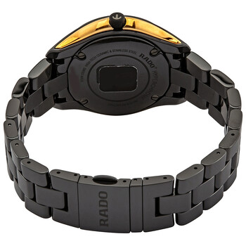 Black ceramic case with a black ceramic bracelet. Fixed black ceramic bezel. Black dial with luminous rose gold-tone hands and index hour markers. Dial Type: Analog. Luminescent hands. Quartz movement. Scratch resistant sapphire crystal. Pull / push crown. Solid case back. Round case shape. Case dimensions: 36 mm x 41 mm. Case thickness: 10 mm. Band width: 16 mm. Fold over clasp with a push button release. Water resistant at 50 meters / 165 feet. Functions: hour, minute, second. Hyperchrome Series. Casual watch style. Watch label: Swiss Made. Rado HyperChrome Quartz Black Dial Ladies Watch R32214152.