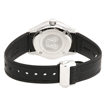Stainless steel case with a black leather strap. Fixed rose gold-plated ceramos bezel. Black sunburst dial with luminous rose gold-tone hands and index hour markers. Dial Type: Analog. Luminescent hands. Quartz movement. Scratch resistant sapphire crystal. Pull / push crown. Solid case back. Round case shape. Case dimensions: 32 mm x 37 mm. Case thickness: 9 mm. Band width: 15 mm. Band length: 6.5 inches. Fold over clasp with a push button release. Water resistant at 50 meters / 165 feet. Functions: hour, minute, second. Dress watch style. Watch label: Swiss Made. Rado Hyperchrome S Black Sunburst Black Leather Ladies Watch R32976155.