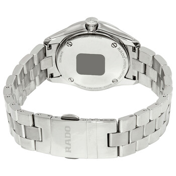 Stainless steel case with a stainless steel bracelet. Fixed stainless steel bezel set with diamonds. Silver dial with luminous silver-tone hands and index hour markers. Minute markers around the outer rim. Dial Type: Analog. Luminescent hands and markers. Date display at the 3 o'clock position. Quartz movement. Scratch resistant sapphire crystal. Pull / push crown. Solid case back. Round case shape. Case dimensions: 31 mm x 37 mm. Case thickness: 9 mm. Band width: 15 mm. Band length: 7 inches. Fold over clasp with a push button release. Water resistant at 50 meters / 165 feet. Functions: date, hour, minute, second. Dress watch style. Watch label: Swiss Made. Rado HyperChrome Silver Dial Diamond Ladies Watch R32112103.