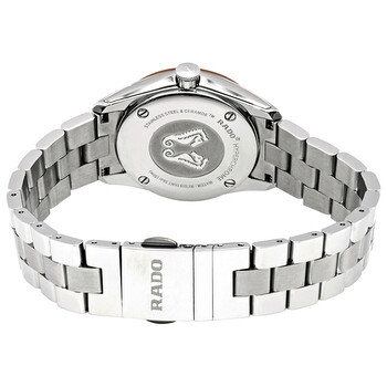 Silver-tone ceramos case with a silver-tone ceramos band. Fixed rose gold-tone ceramos bezel. Silver dial with rose gold-tone hands and index hour markers. Minute markers around the outer rim. Dial Type: Analog. Luminescent hands and markers. Date display at the 3 o'clock position. Quartz movement. Scratch resistant sapphire crystal. Pull / push crown. Solid case back. Round case shape. Case size: 31 mm. Case thickness: 9 mm. Band width: 15 mm. Band length: 6.5 inches. Fold over clasp with a push button release. Water resistant at 50 meters / 165 feet. Functions: date, hour, minute, second. Additional Info: Ceramos is a hi-tech ceramic & metal composite. Hyperchrome Series. Luxury watch style. Watch label: Swiss Made. Rado Hyperchrome Silver Dial Ladies Watch R32976123.