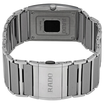 Stainless steel case with a stainless steel bracelet with ceramic (ceramos) inserts. Fixed stainless steel bezel. Black dial with silver-tone hands and index hour markers. Dial Type: Analog. Date display above the 6 o'clock position. Rado calibre 152 quartz movement. Scratch resistant sapphire crystal. Pull / push crown. Solid case back. Rectangle case shape. Case dimensions: 40 mm x 27 mm. Case thickness: 8 mm. Band width: 26 mm. Band length: 7 inches. Deployment clasp. Water resistant at 30 meters / 100 feet. Functions: date, hour, minute, second. Dress watch style. Rado Integral Black Dial Ceramic Men's Watch R20784159.