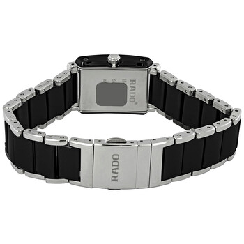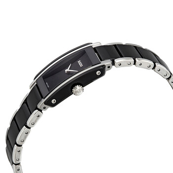 Stainless steel and ceramic case with a stainless steel and ceramic bracelet. Fixed bezel. Black dial with silver-tone hands. Dial Type: Analog. Quartz movement. Scratch resistant sapphire crystal. Solid case back. Case size: 22.7 mm x 33.1 mm. Rectangle case shape. Water resistant at 50 meters / 165 feet. Functions: hour, minute. Dress watch style. Watch label: Swiss Made. Rado Integral Black Dial Ladies Watch R20613152.