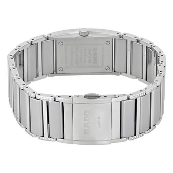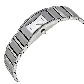 Silver-tone stainless steel case with a silver-tone stainless steel and ceramic bracelet. Fixed, diamond set stainless steel bezel. Silver dial with silver-tone hands and diamonds hour markers. Dial Type: Analog. Rado Calibre 153 quartz movement. Scratch resistant sapphire crystal. Pull / push crown. Solid case back. Rectangle case shape, case size: 24.8 mm x 19.2 mm, case thickness: 6 mm. Band width: 19 mm, band length: 6.5 inches. Double folding with push button clasp. Water resistant at 30 meters / 100 feet. Functions: hour, minute. Additional Info: case set with 46 diamonds (.13ct). Dress watch style. Watch label: Swiss Made. Rado Integral Diamond Silver Dial Ladies Watch R20733122.