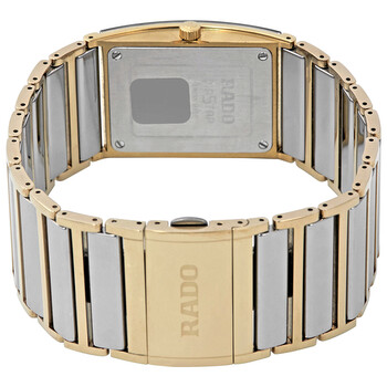Platinum-tone stainless steel case with a yellow gold PVD coated and ceramos stainless steel bracelet. Fixed two tone stainless steel bezel. Silver dial with gold-tone hands and diamonds hour markers. Dial Type: Analog. Date display at the 6 o'clock position. Rado Calibre 152 quartz movement. Scratch resistant sapphire crystal. Solid case back. Rectangle case shape, case size: 27.1 mm x 34.2 mm, case thickness: 8 mm. Water resistant at 30 meters / 100 feet. Functions: date, hour, minute, second. Dress watch style. Watch label: Swiss Made. Rado Integral Diamond Silver Dial Ladies Watch R20748702.